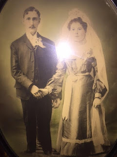 My grandmother's wedding photo. She lost my handsome grandfather Joseph in February 1927. He and their youngest son Anthony "Tony" were trapped and killed in a gold mine in Victor, Colorado. I often wondered how she managed to go on with five little girls and my Uncle Louie as the only man left in her phamily. I have their original marriage photo. Of course, you know Auntie Ang gave it to me. She knew I adored my grandmother. It is the only original photo of my grandparents that I have. I cherish it. I will treasure it my whole life. It has the beveled glass and I can never get a good shot of it. But I am not a great photographer either.
